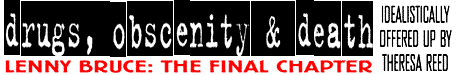 Even with his mind and body craving needle candy nearly constantly, he managed to continue fighting the court (though he never learned to keep his mouth shut) and performing, although his humor became increasingly serious...almost desperate, at times. Lennys paranoia and disorientation were becoming too much for him. He began attacking prominent individuals, instead of philosophies. It became standard for Lenny to be under arrest before he got out the door after a show, so its no surprise that he told his fans I wasnt funny tonight. Sometimes Im not. Im not a comedian. Im Lenny Bruce." His frustration with the ignorance of those who persecuted him for his comic bits increased. Words were not the enemy, he insisted. It was the unwillingness of the listener to understand how words work and to apply logic to what they had heard. Had Lenny avoided the needle, he might have survived to see his ideas vindicated. Although he served some time for narcotics, his obscenity charges were always vindicated in higher courts.