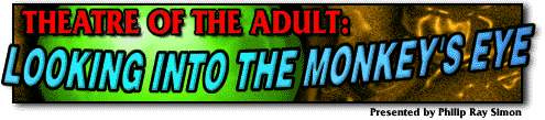 Plays like The Monkeys Eye ask How much can you get away with in theatre?" From freakish musicfest puppet shows to the Paris Theatres Fetish Night stage skits, Ive seen several acts which, though entertaining, seem to have been done for shock value alone. You can find this in any creative medium. Works which can incorporate this dance of shock attack into their whole and still leave us thinking about something larger than, or in, ourselves are the ones that succeed in making their point. If youre not finding creative adult theatre like this in your burg, you should ask for it, or, like Michael Destro, start your own troupe.