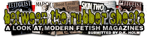 Perhaps the best example of the New Mainstream S&M is Skin Too, the premiere journal of leather fetishism. Like Cruella, it is an English magazine. Skin Too is published by Tim Woodward, who began the magazine as the 16 page club bulletin of a small group of leather-fancying fetishists. Today Skin Too has evolved into a gorgeous 132 page ad-rich glossy, a British Vogue for perverts. Its filled with photo spreads, naughty images from mainstream ads, new fetish fashions and their designers, and news of various fetish balls around the globe.